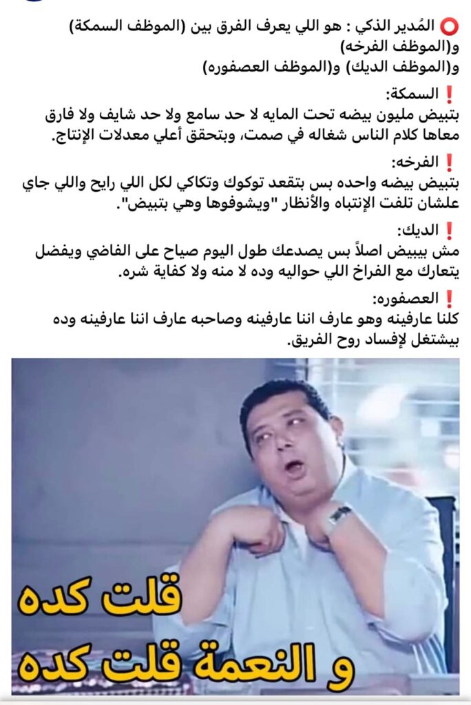الفرق بين الموظف السمكة والفرخة والديك.. ملعوبة بالتأكيد أغلبنا يعرف الموظف العصفورة.. ولكن انتشر مؤخراً بوست لطيف جداً.. يعرفنا بجمل لماحة وذكية عن أنواع أخري من الموظفين.. وهم الموظف السمكة والموظف الفرخة والموظف الديك.. مع توضيح للفرق بينهم.. بطريقة تدعو مع التمعن في المعنى إلى الابتسام!