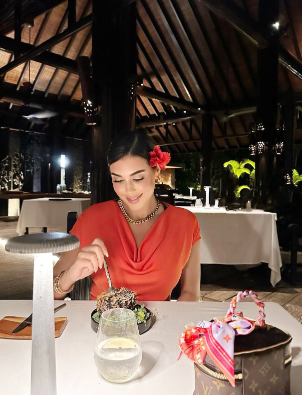 النجمة ياسمين صبري حرصت على مشاركة الجمهور بصور من إجازتها في عيد الأضحى، وأطلت في تلك الصور بفستان ميدي باللون الأحمر انسدل بتصميم مجسم حتى منطقة أسفل الركبة مع أكتاف عريضة انسدل جزء منها ليغطي بداية الذراعين، واختارت ياسمين صبري أن تنسق مع تلك الإطلالة صندل باللون الأصفر، وأمسكت حقيبة باللون البني المنقوش، ووضعت وردة حمراء في شعرها.