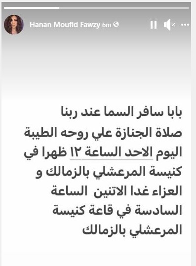 أعلنت حنان ابنة الكاتب الصحفى الكبير مفيد فوزى، وفاة والدها منذ قليل عبر حسابها على فيس بوك، وكتبت حنان، قائلة:” بابا سافر السما عند ربنا وصلاة الجنازة على روحه الطيبة اليوم الأحد الساعة 12 ظهرا في كنيسة المرعشلى بالزمالك والعزاء غدا الاثنين الساعة السادسة في قاعة كنيسة المرعشلى بالزمالك”.